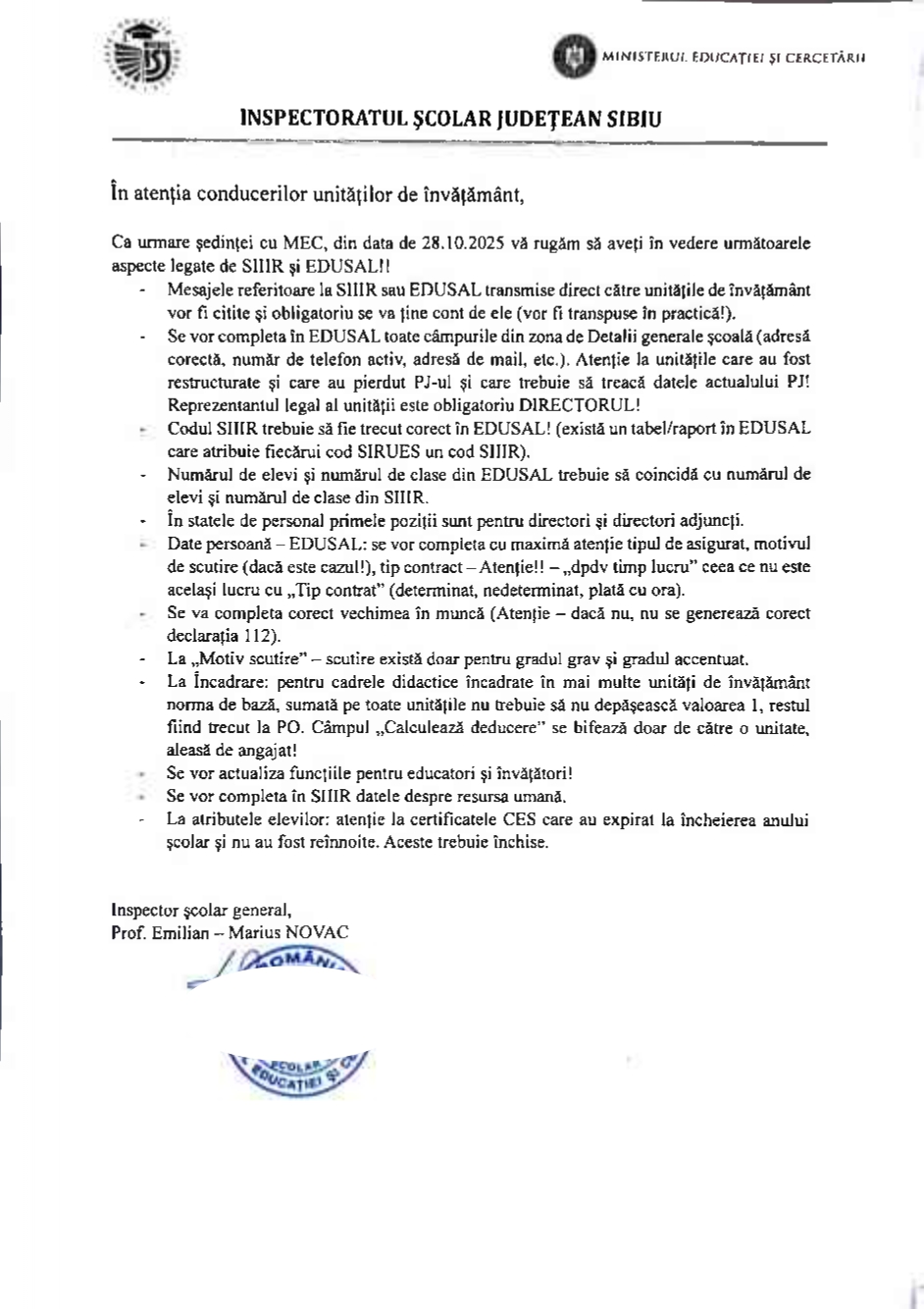 "Ca urmare sedintei cu MEC, din data de 28.10.2025 va rugam sa aveti in vedere urmatoarele aspecte legate de SIIIR si EDUSAL!!