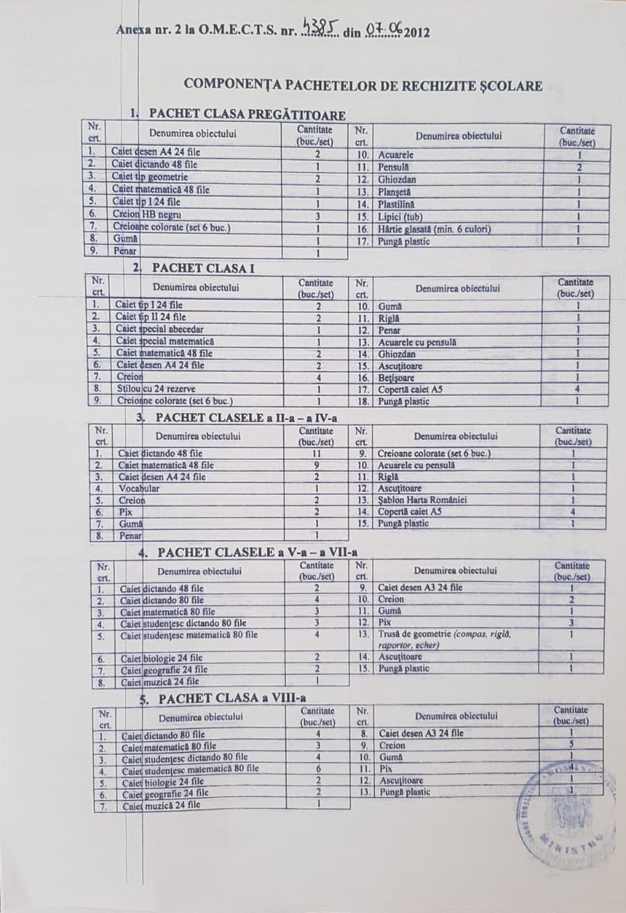 La fel ca anul trecut, valoarea ajutorului de rechizite va fi de 65 de lei/pachet/elev din invatamantul primar, respectiv 75 lei/pachet/elev din invatamantul gimnazial.