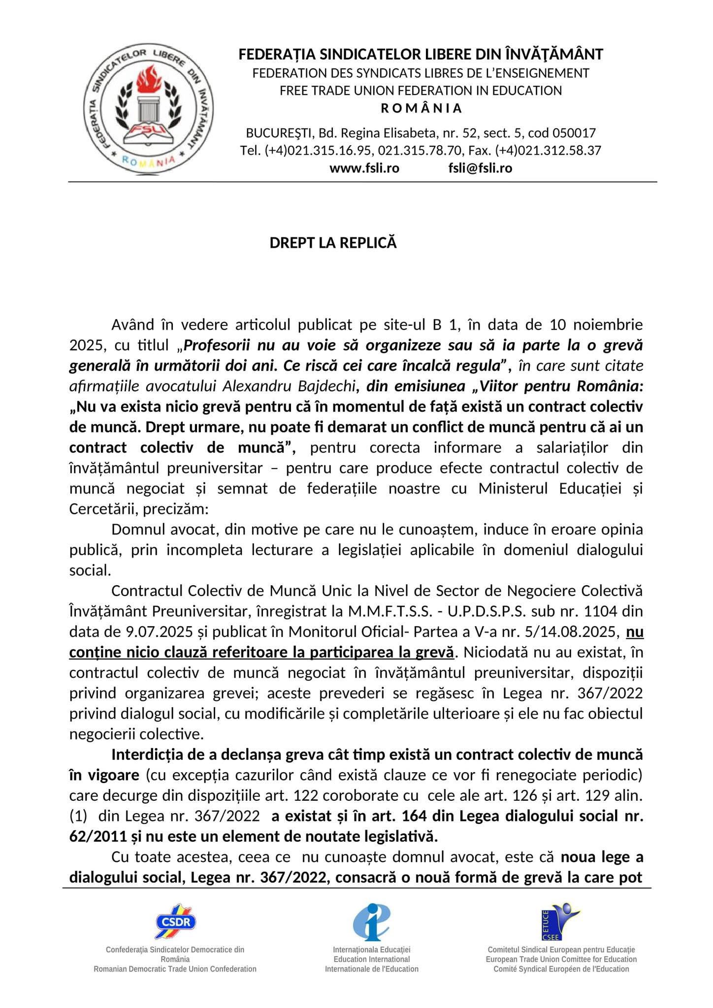 "Ceea ce nu cunoaste domnul avocat este ca noua Lege a dialogului social, Legea nr.367/2022, consacra o noua forma de greva la care pot recurge doar federatiile si confederatiile sindicale reprezentative - Greva impotriva politicii sociale si economice a Guvernului.
