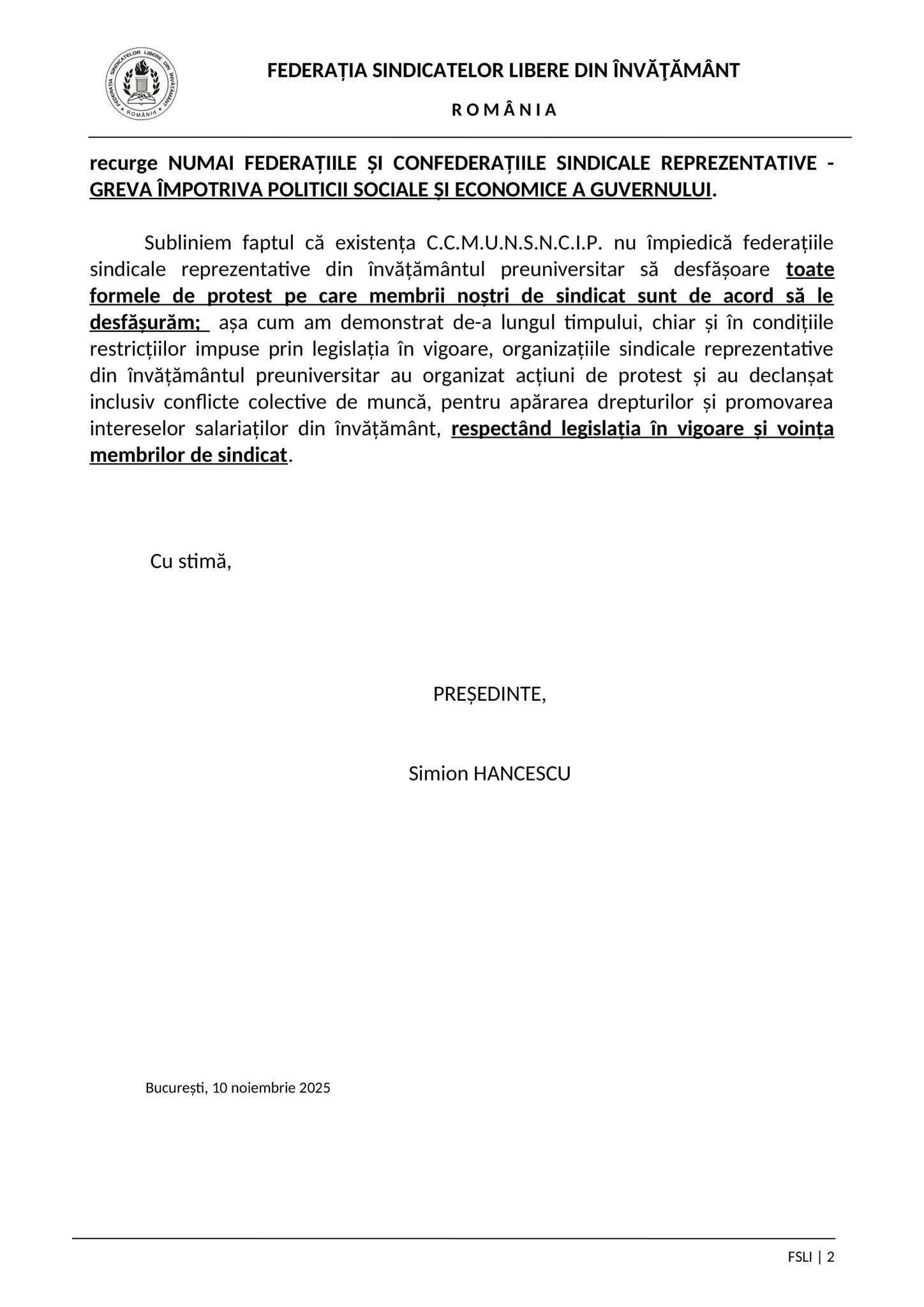 Subliniem faptul ca existenta C.C.M.U.N.S.N.C.I.P. nu impiedica federatiile sindicale reprezentative din invatamantul preuniversitar sa desfasoare toate formele de protest pe care membrii nostri de sindicat sunt de acord sa le desfasuram; asa cum am demonstrat de-a lungul timpului, chiar si in conditiile restrictiilor impuse prin legislatia in vigoare, organizatiile sindicale reprezentative din invatamantul preuniversitar au organizat actiuni de protest si au declansat inclusiv conflicte colective de munca, pentru apararea drepturilor si promovarea intereselor salariatilor din invatamant, respectand legislatia in vigoare si vointa membrilor de sindicat".