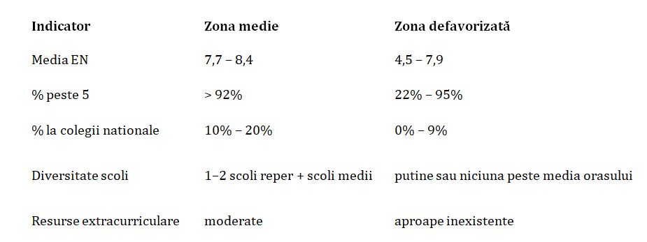 Concluzie pentru cartierele defavorizate: diferenta fata de cartierele de top este uriasa, de ordinul a 15–20 de puncte procentuale la admiterea in colegii nationale. Problema este structurala si necesita interventie coordonata din partea autoritatilor, ONG-urilor si comunitatilor locale.