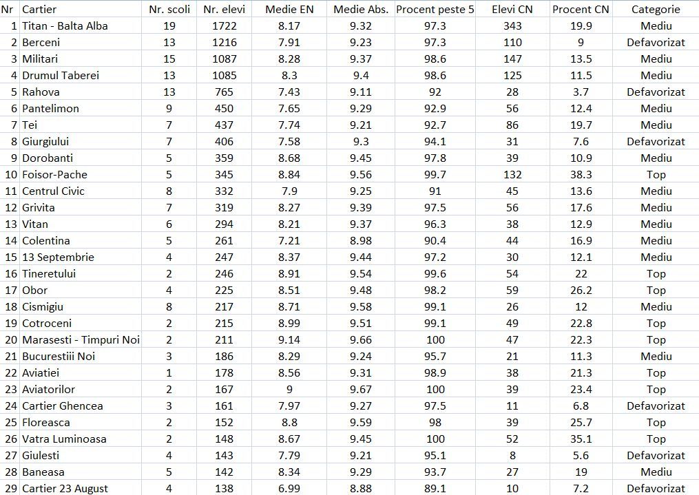 AIParte.ro arata ca anumite cartiere din Bucuresti reusesc sa asigure performanta de a obtine medii mai bune la Evaluarea Nationala, ceea ce asigura sanse mai bune pentru elevii lor de a intra la un colegiu national, considerat principalul indicator al performantei de top.