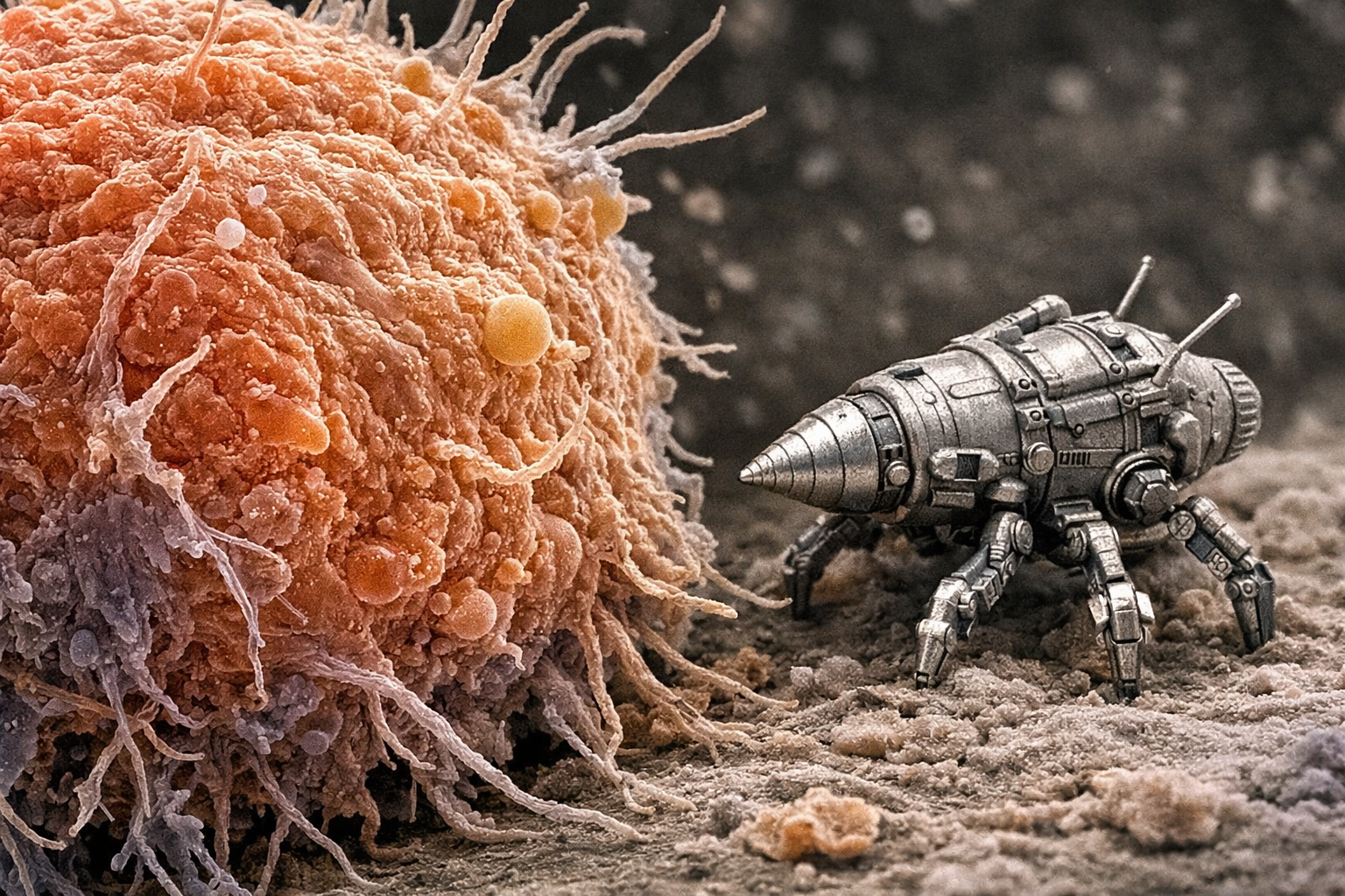 In continuare va arata o imagine impresionanta (proiectata sau printata mare) cu un nanorobot vazut la microscop electronic langa o celula umana.