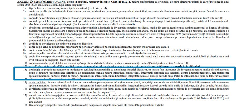 "13) declaratie pe proprie raspundere ca nu desfasor activitati incompatibile cu demnitatea functiei didactice, ca nu am fost indepartat din invatamant pentru motive disciplinare sau printr-o hotarare judecatoreasca definitiva de condamnare penala pentru infractiuni contra vietii, integritatii corporale sau sanatatii, contra libertatii persoanei, rele tratamente aplicate minorului, hartuire, trafic de minori, proxenetism, infractiuni contra libertatii si integritatii sexuale, luare si dare de mita, trafic de influenta, fals si uz de fals, furt calificat"
